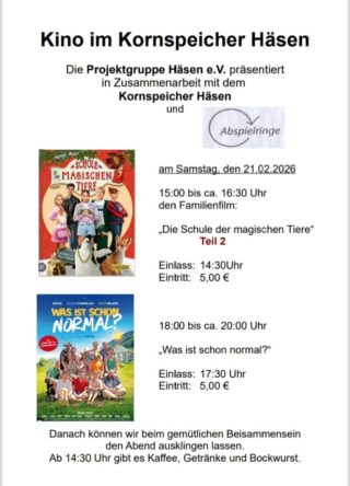 Um 15.00 Uhr gibt es einen Kinderfilm „Die Schule der magischen Tiere“ Teil 2. Kommt vorbei und macht Euch mit Euren Kindern und Enkeln einen schönen Kinonachmittag mit frischem Popcorn und Getränken.